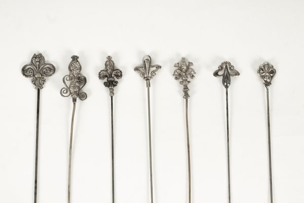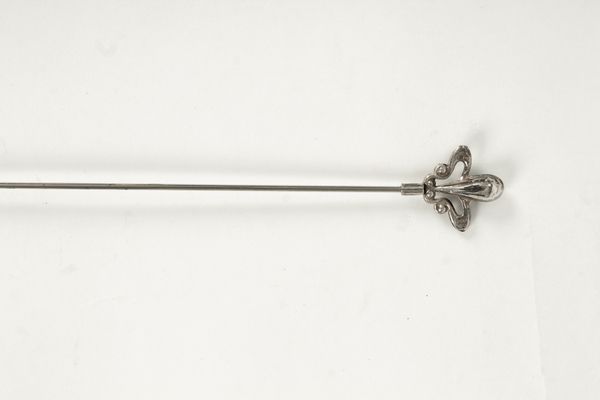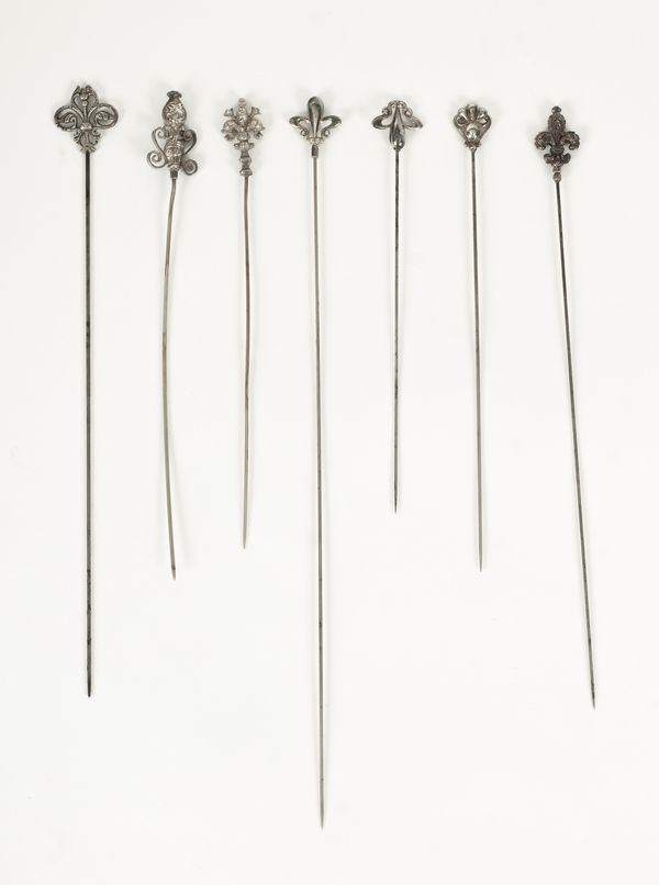 A Pearce & Thompson silver hatpin, Birmingham hallmark, two fleur-de-lis white metal hatpins and four other white metal hatpins (7)