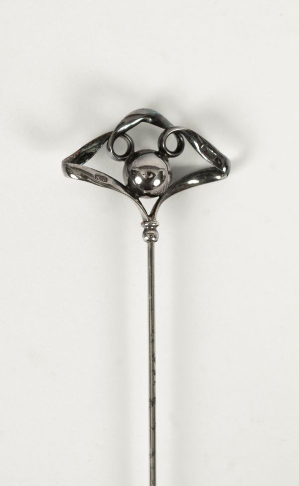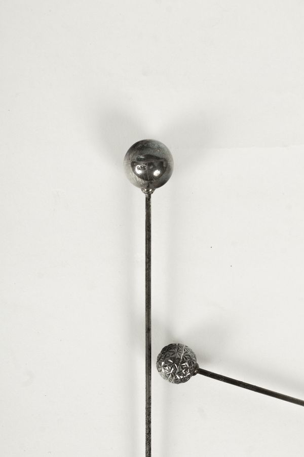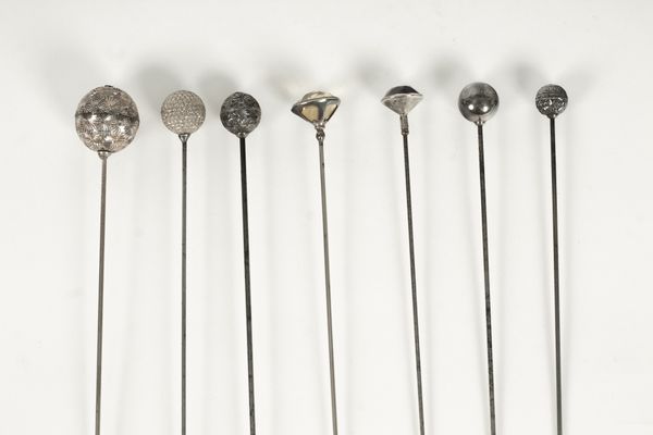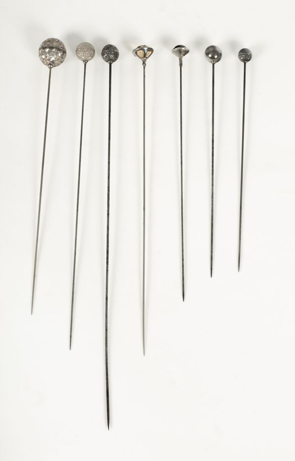 Two Charles Horner silver hatpins. set with a citrine and an amethyst, both with Chester hallmarks, a silver ball Charles Horner hatpin, and four white metal engraved ball hatpins, unmarked