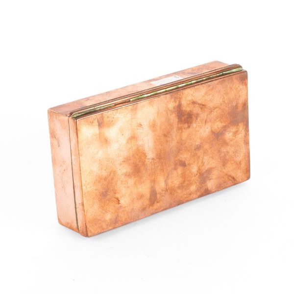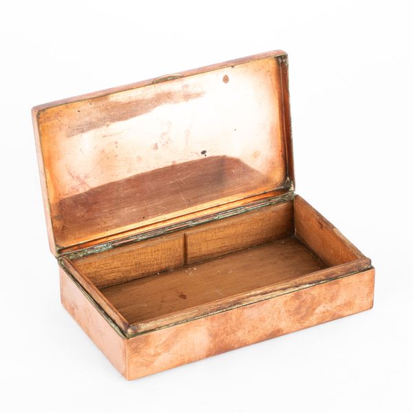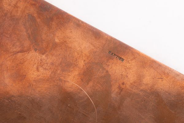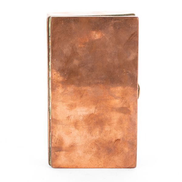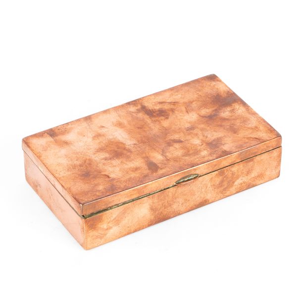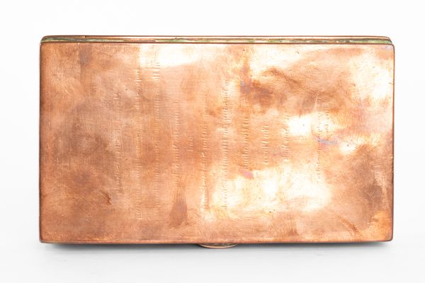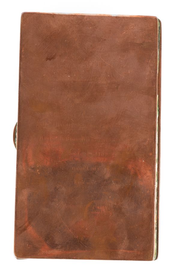 A Cartier copper cigarette box of rectangular form, the hinged cover mirror engraved with a wedding invitation in New York, stamped 'Cartier' to base, approximately 16.5cm long