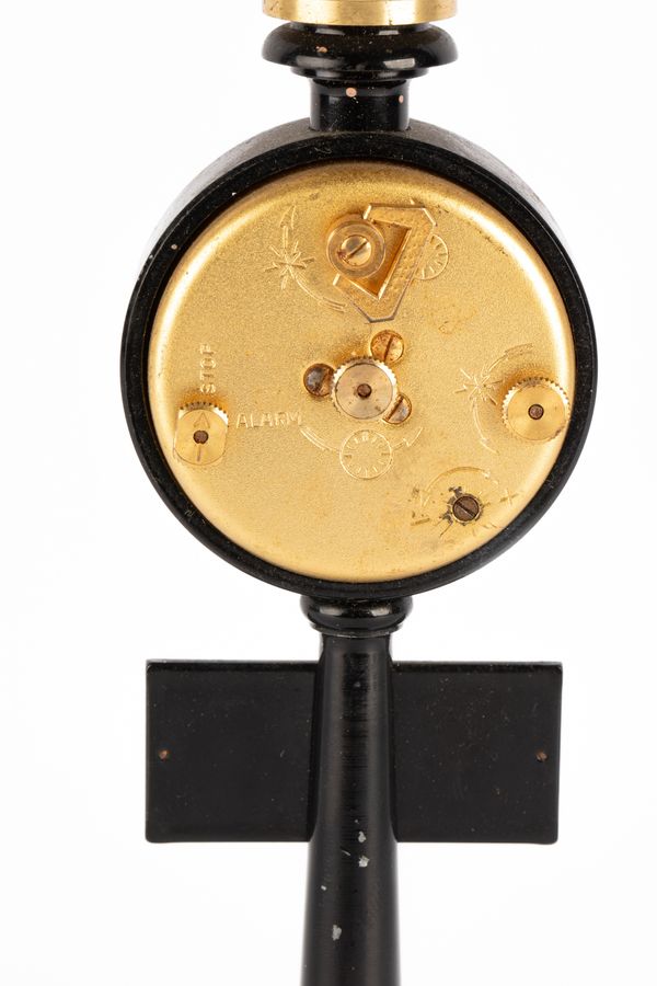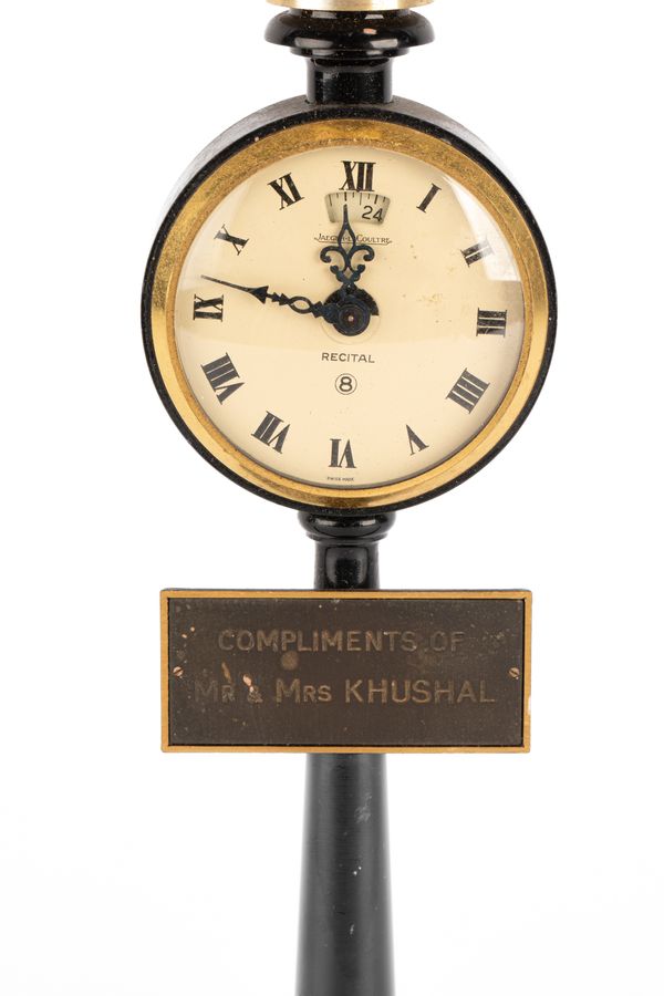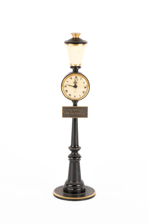 A Jaeger-Le-Coultre 'Rue De La Paix' Street Lamp Table Clock, in the form of a Parisian street lamp, black column with gilt metal, with alarm and subsidiary dial, the sign below marked' compliments of Mr & Mrs Khushal', no. 107 X to base, 28.5cm high
