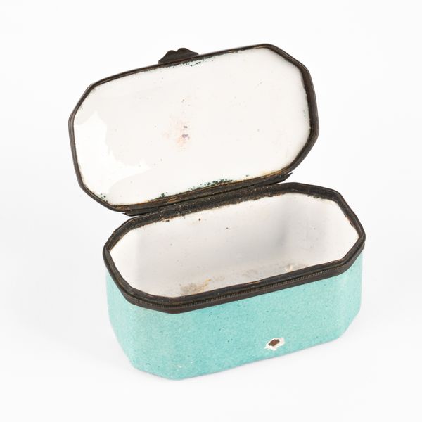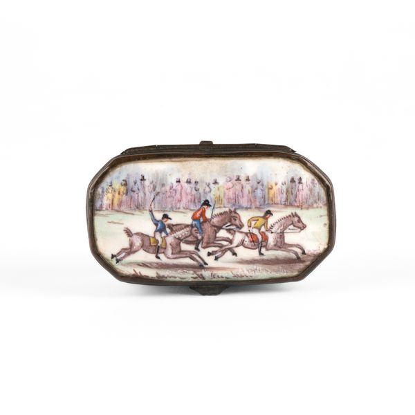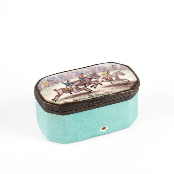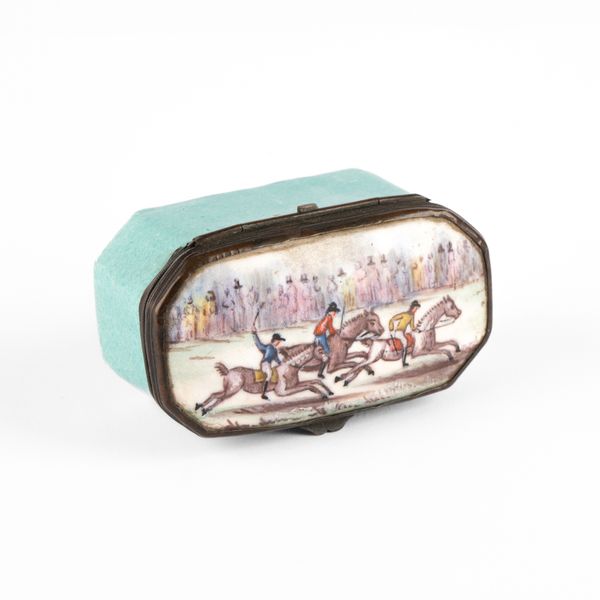 A 19th Century Bilston enamel patch box of canted rectangular form, the hinged cover depicting horse racing and spectators, with a turquoise enamel base, approximately 5.7cm long