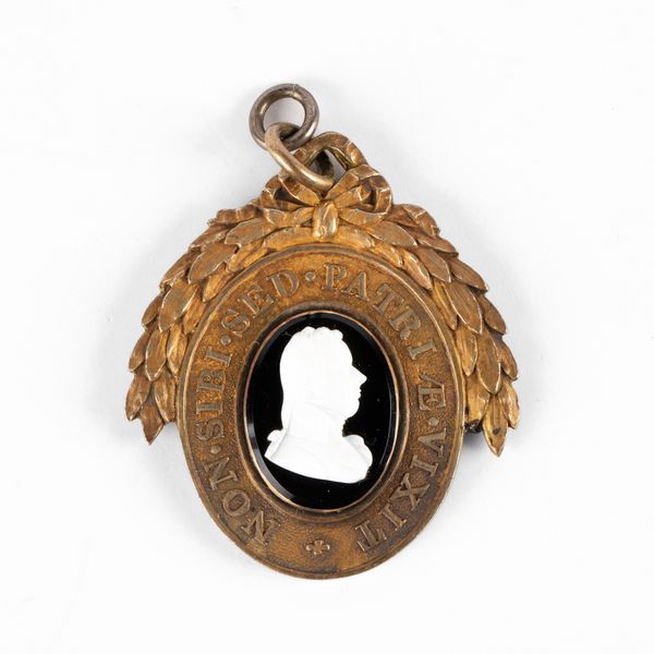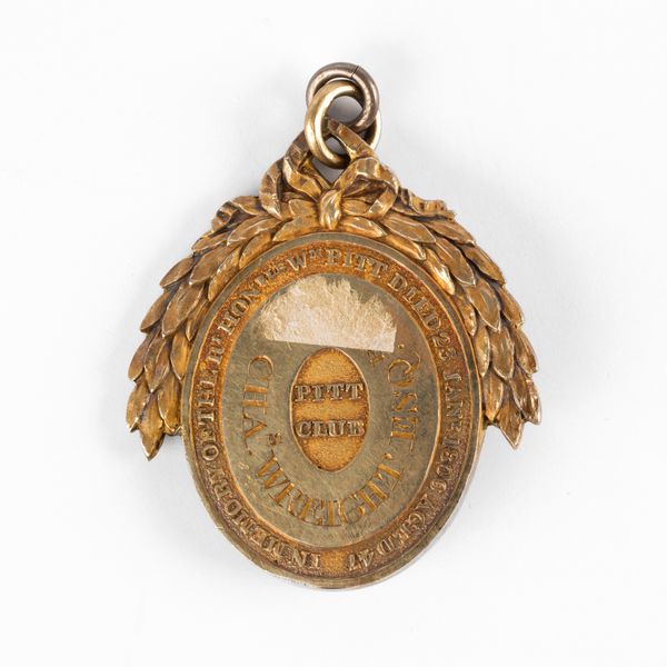 An early 19th Century gilt metal Pitt Club medallion, set with a black and white oval cameo portrait, with inscription 'NON.SIVI.SED.PATRI AE.VIXIT', bow and garland surmount, the reverse inscribed 'In memory of the RT Hon Wm Pitt, died 23 Jan 1806, aged 47, Chas Wreight Esq'