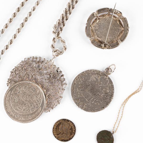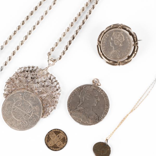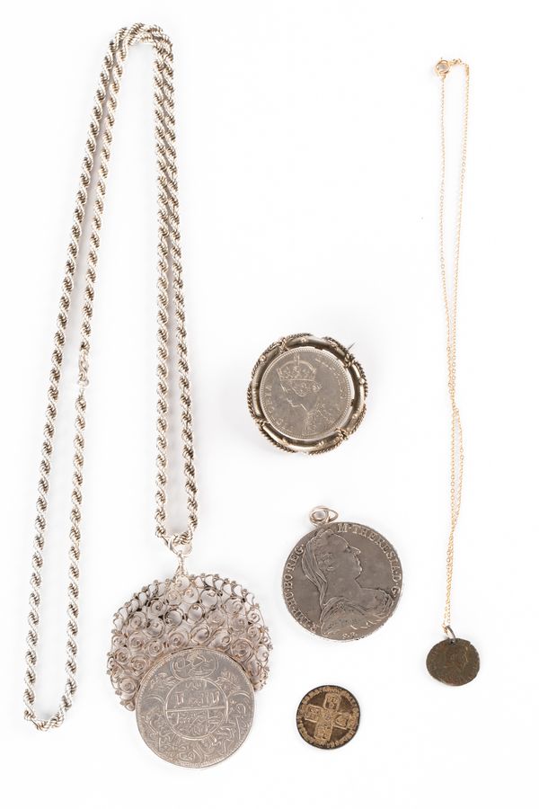 A quantity of coins, comprising a George II sixpence, 1758, a Victorian One Rupee, 1885, mounted as a brooch, a Maria Theresa thaler with pendant loop attachment, a Yemeni One Riyal coin in a pierced scrolling pendant mount on a white metal ropetwist chain and a Constantine II Roman copper coin, drilled and on a fine 9ct gold chain, the chain approximately 1g