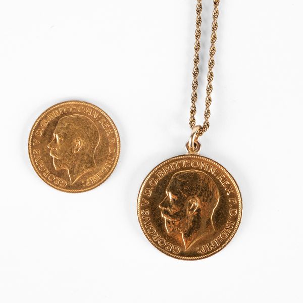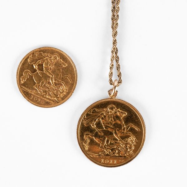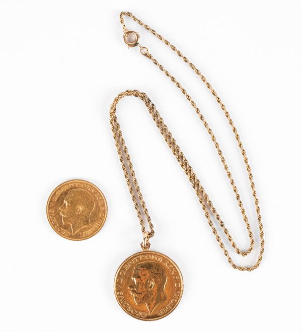 A George V 1911 gold sovereign, on a pendant mount, suspended from a yellow gold rope twist chain, stamped '10', total gross weight approximately 10.9g, together with a 1912 half sovereign