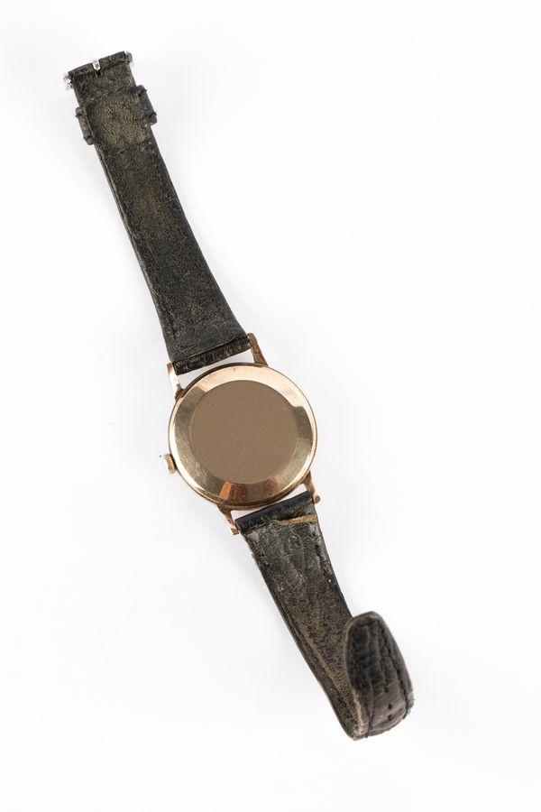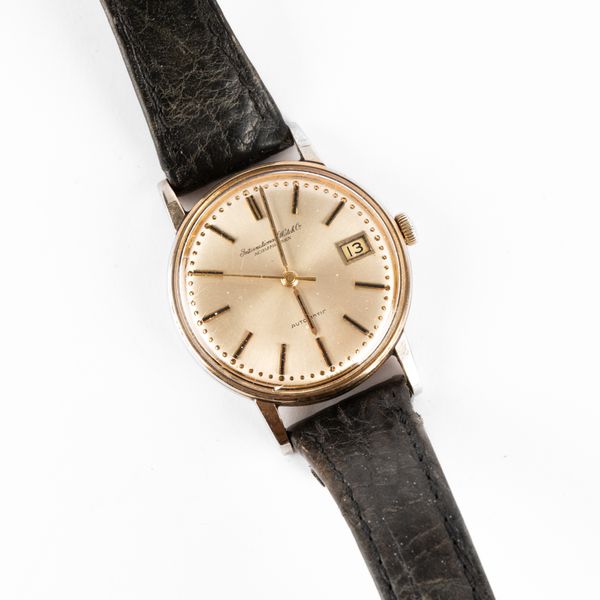 A gentleman's International Watch Company automatic gold wristwatch, circular champagne dial with baton indicators, subsidiary date aperture, 32mm case, on a brown leather strap