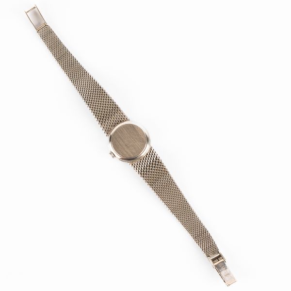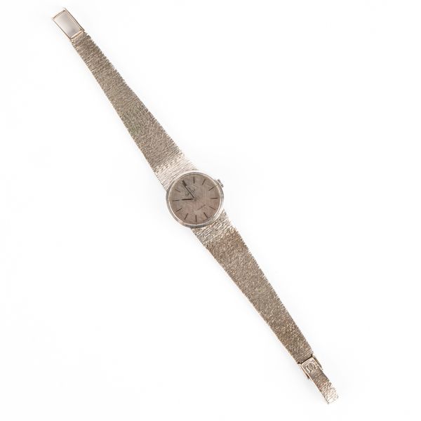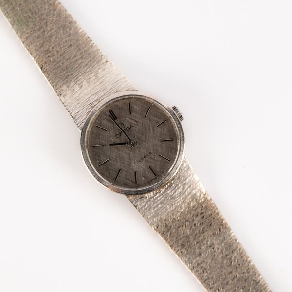 A lady's 9ct white gold Omega wristwatch, circular textured dial with baton indicators, case approximately 21mm, integral textured white gold bracelet with Omega clasp, London import marks for 1973, total gross weight approximately 27.7g
