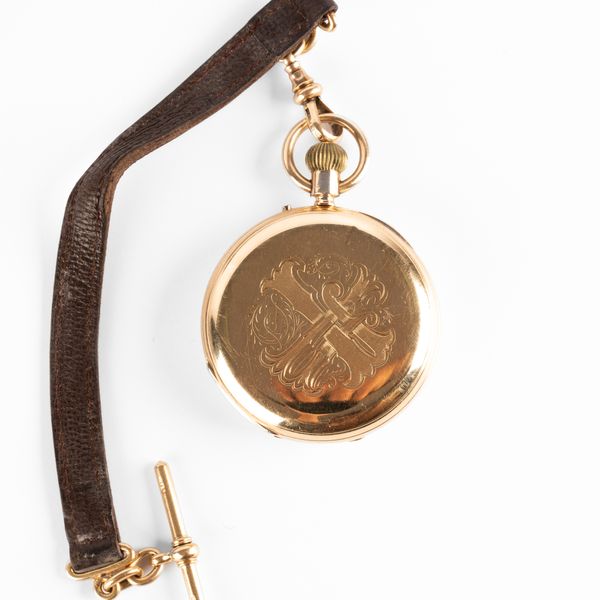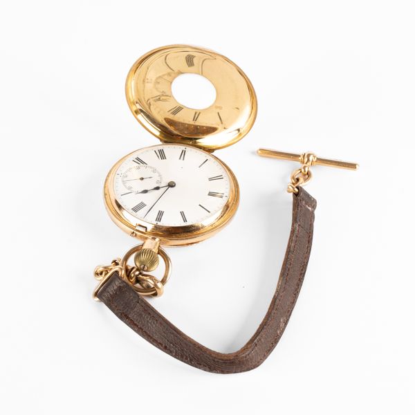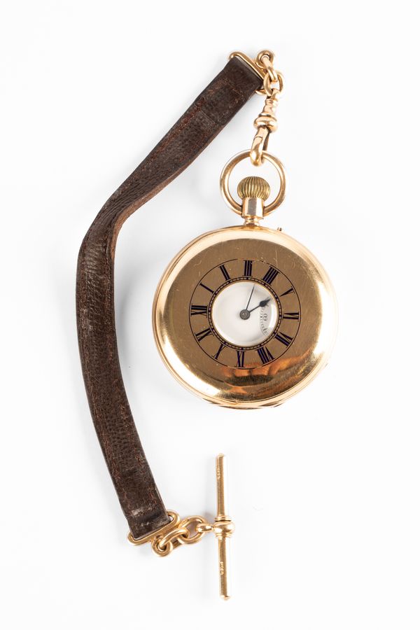 An 18ct gold cased half-hunter pocket watch, the white enamel dial with Roman numerals and subsidiary seconds dial, the movement signed Hall & Co., 56 King St Manchester and numbered 12453, the case by George Henry Harwood with monogram to back and blue enamel numerals to the front, on a leather strap with 18ct gold clip and T-bar, case diameter 5cm, weight (excluding strap) approximately 125g