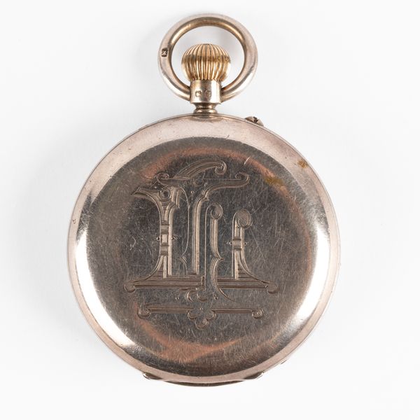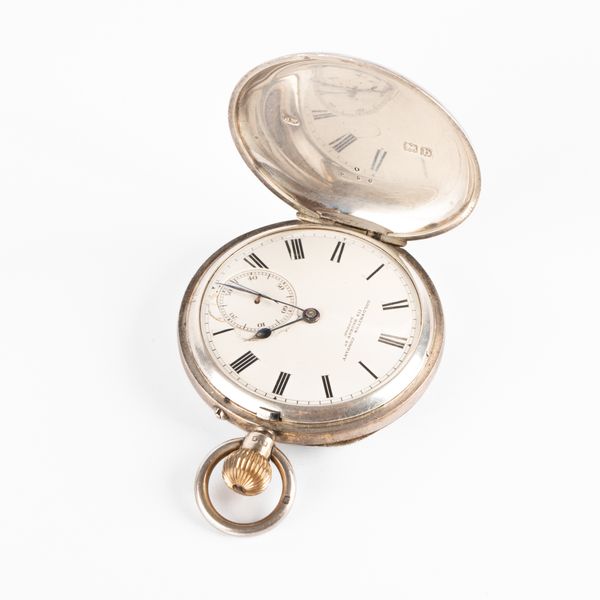 A late Victorian silver cased hunter pocket watch, the white enamel dial with Roman numerals, subsidiary seconds and signed Goldsmiths Company, 112 Regent St, London, movement also signed and numbered 126768, case JW, London 1897, monogrammed, case diameter 5cm, approximately 108g gross