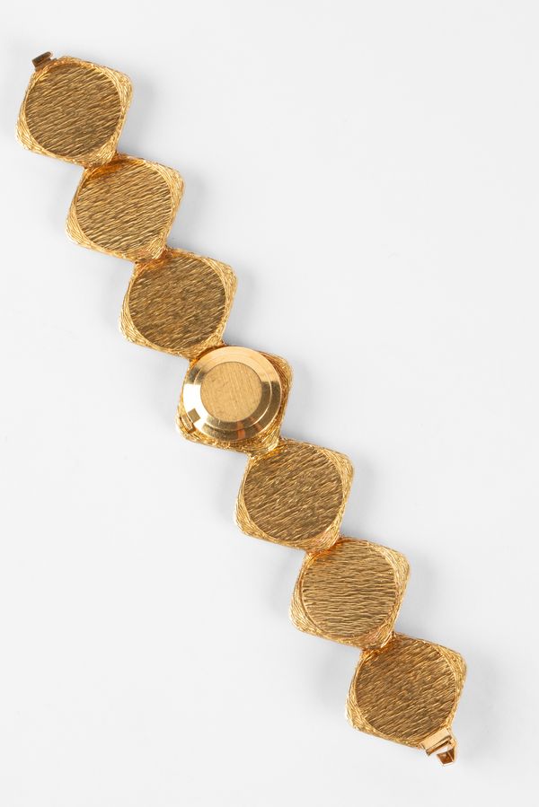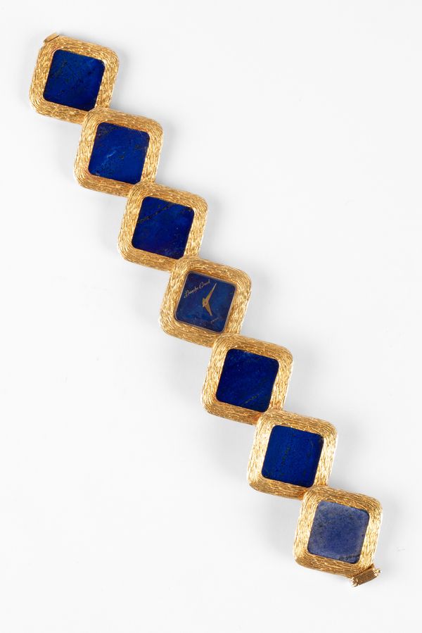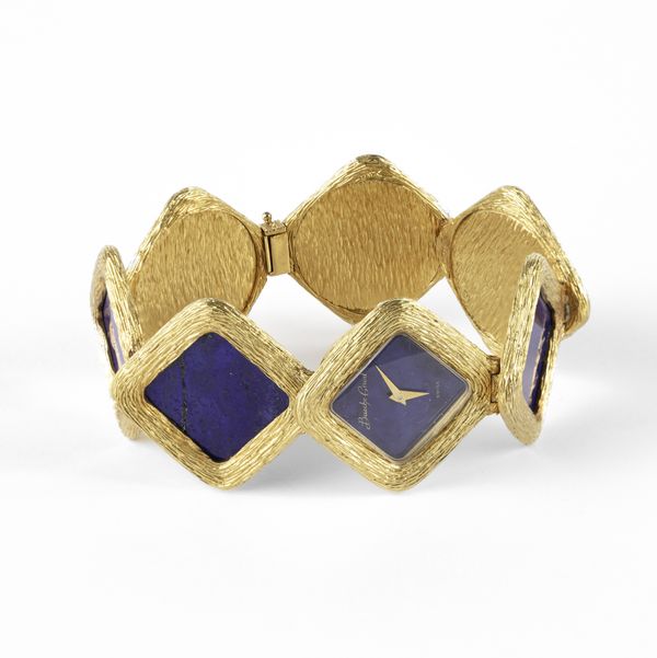 A lady's 18k yellow gold Bueche Girod wristwatch having seven square panels set with lapis lazuli, textured borders, approximately 18.5cm long, hallmarks London 1970, total gross weight approximately 89.6g