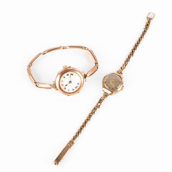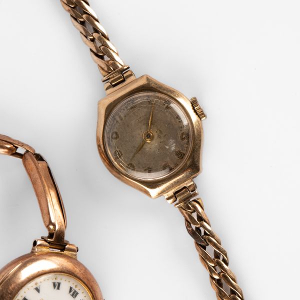 A lady's 9ct rose gold cased Rolex wristwatch, the circular white enamel dial with Roman numerals, movement signed Rolex, case with import marks for London 1912, on an expanding 9ct bracelet and a 9ct yellow gold cased wristwatch, the circular silvered dial with Arabic numerals, the 15 jewel movement signed Chs Tissot & Fils, numbered 3032846, case by Dennison, on a 9ct bracelet, gross weight approximately 34g
