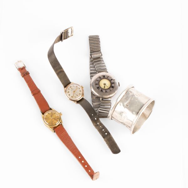 A lady's Cyma wristwatch in a 9ct gold case, a lady's silver wristwatch in a half-hunter style silver case with Swiss movement, a lady's Sahida wristwatch and a silver napkin ring (4)