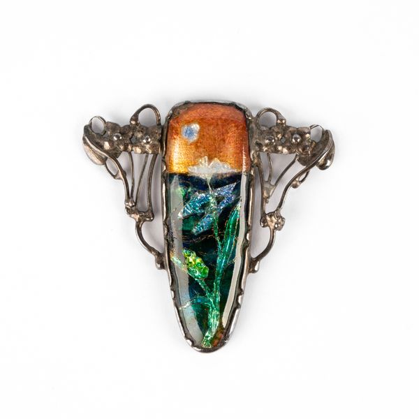 By repute, presented as a gift to Sylvia Webley (circa 1886-1968) by Howard Carter (1874–1939, British archaeologist and Egyptologist who discovered the intact tomb of the Pharaoh Tutankhamun in 1922) after her husband Samuel Webley (1877–1956) had gifted a painting to Carter at an exhibition of his works in London. The pendant was presented during an event at the Royal Academy, where Carter took a liking to one of Webley's paintings. Webley pioneered the use of decorative iridescent panels in the 1930s, painting in a pointillist manner over panels gilded with gold.