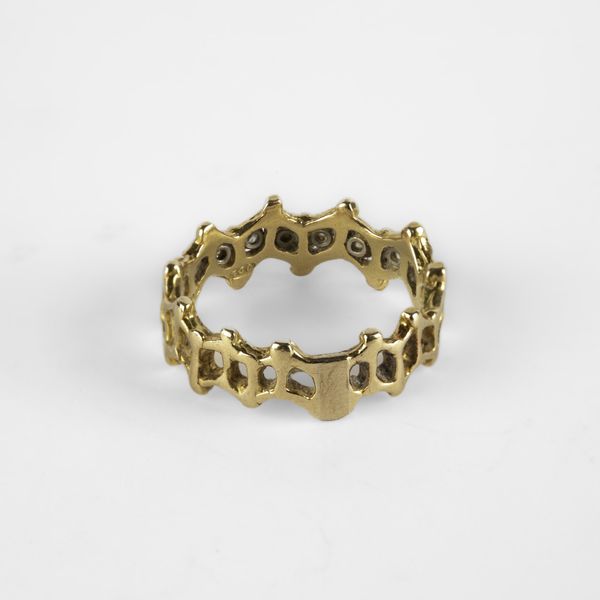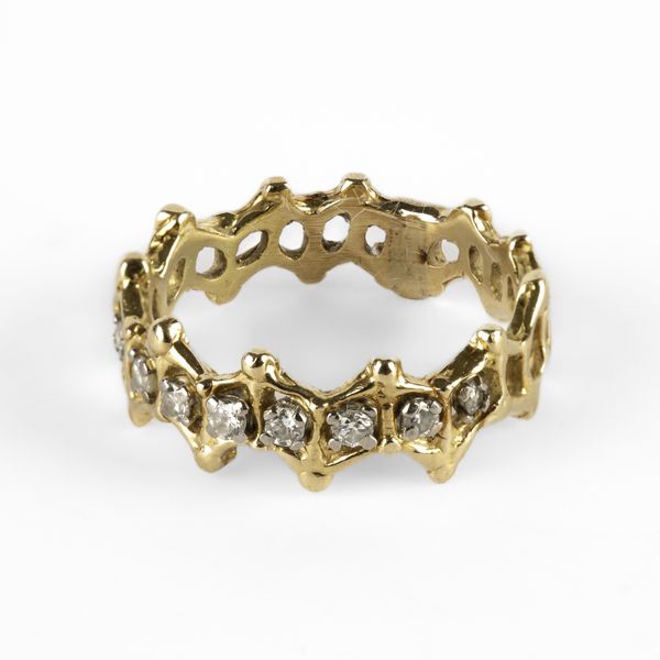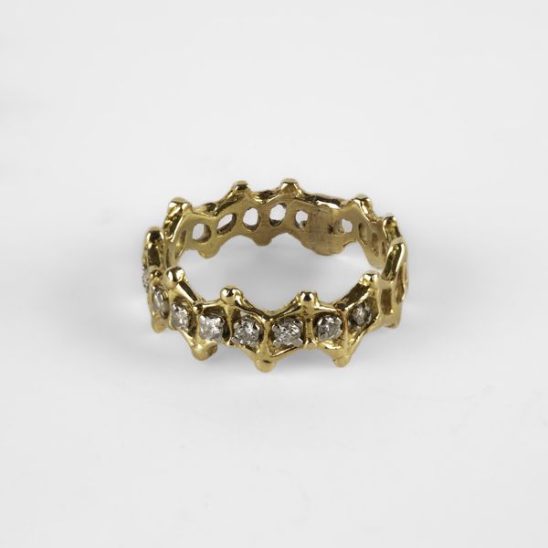 An 18ct yellow gold and diamond ring, set with nine round brilliant cut diamonds, in a stylised band, ring size N1/2, total gross weight approximately 4.5g