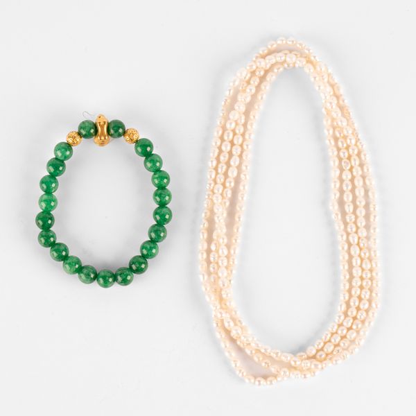 A jade beaded bracelet, having two yellow metal beads and a yellow metal animal figure, total gross weight approximately 18.7g, together with a strand of pearls, approximately 67cm long