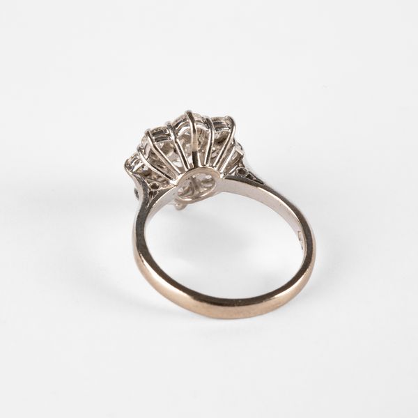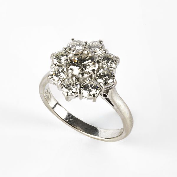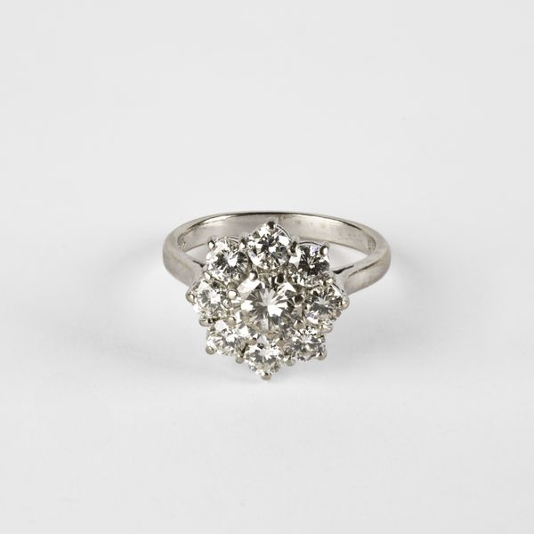 An 18ct white gold and diamond cluster ring, the central round brilliant cut diamond approximately 0.80ct, assessed colour H/I, assessed clarity VS1/VS2, within a border of eight small round brilliant-cut diamonds, each approximately 0.15ct, assessed colour H/I, total estimated diamond weight approximately 2 carats, ring size M, total gross weight approximately 5.16g