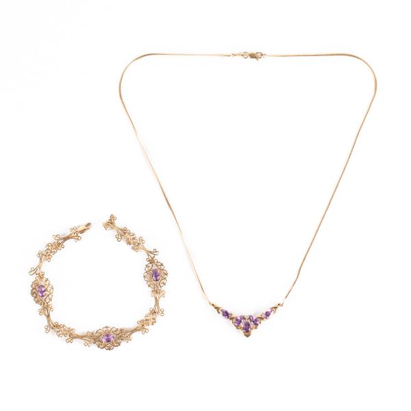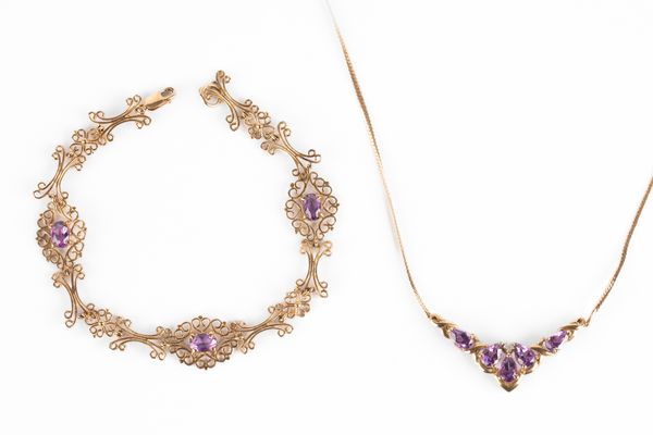 A 9ct yellow gold and amethyst necklace and bracelet, the necklace set with five pear cut amethyst, and a single diamond, the bracelet set with three oval cut amethyst, total combined gross weight approximately 9.3g