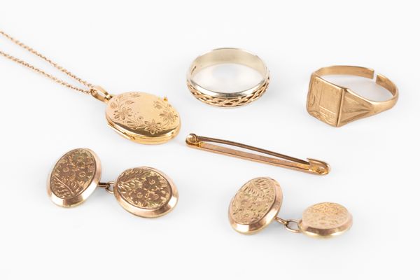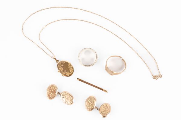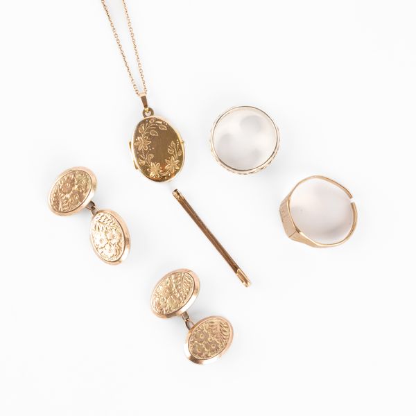 A collection of yellow metal jewellery, including two 9ct gold rings, a pair of cufflinks, a locket, and a bar brooch, total combined gross weight approximately 15.9g