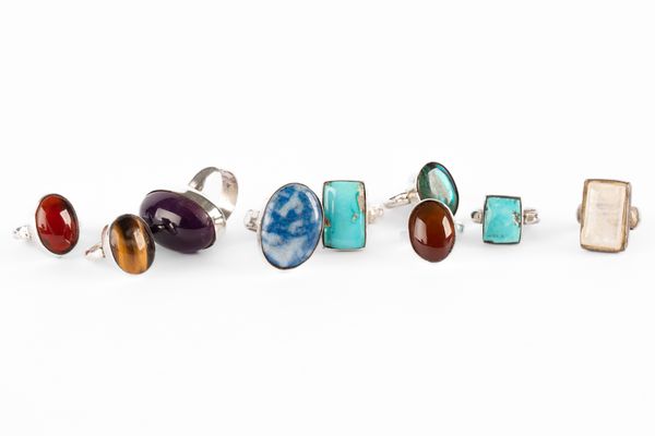 A group of nine silver gem set rings, including amethyst, tiger's eye, turquoise, etc, total gross weight approximately 87.8g