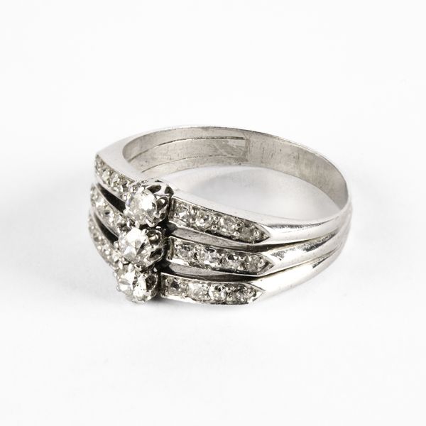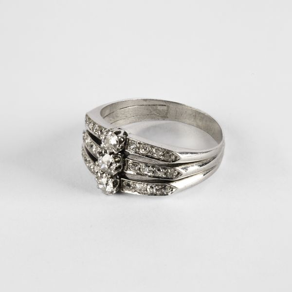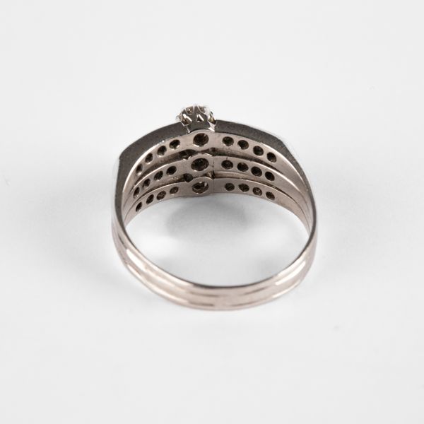 A white metal and diamond dress ring, having three rows of old cut diamonds, each set with a larger principal diamond (approximately 3mm each), ring size N, stamped 'PL', total gross weight approximately 4.8g