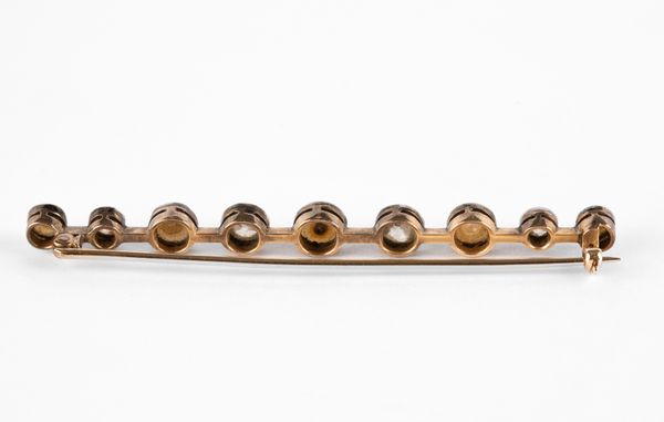 An early 20th Century yellow metal diamond and pearl bar brooch, set with four graduated old cut diamonds and five graduated pearls, rubover settings, approximately 6.5cm long, unmarked, total gross weight approximately 5.3g