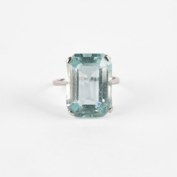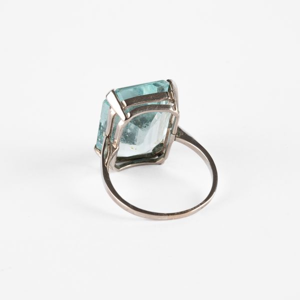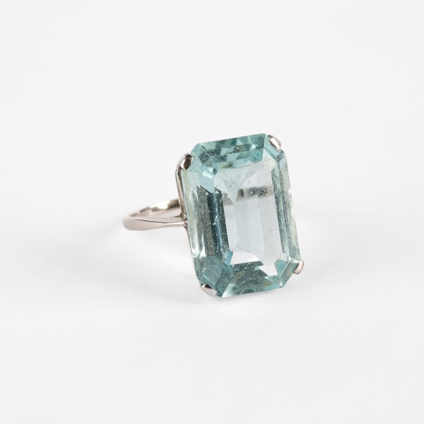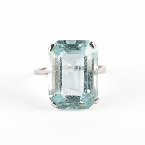 A white metal and aquamarine cocktail ring, set with a step cut aquamarine, approximately 18.81mm x 13.61mm x 7.86mm, unmarked, size P, total gross weight approximately 5.7g