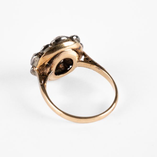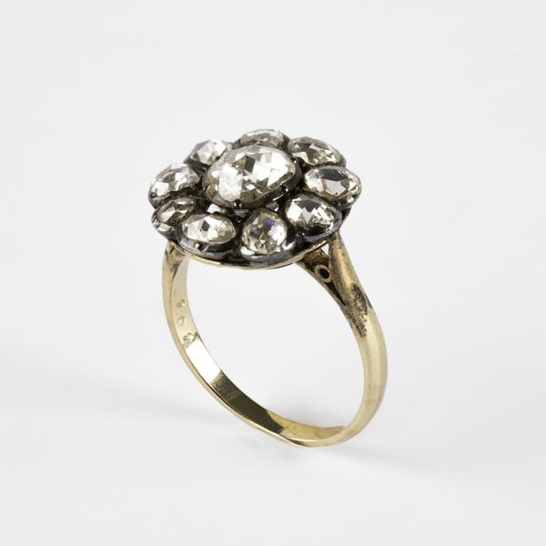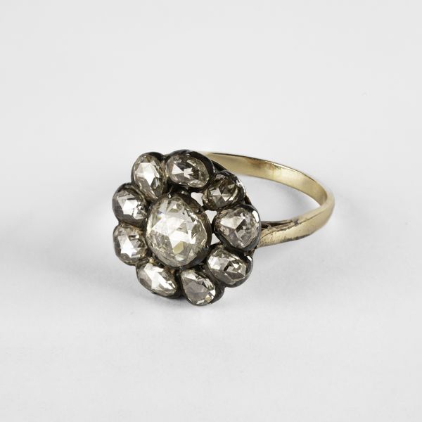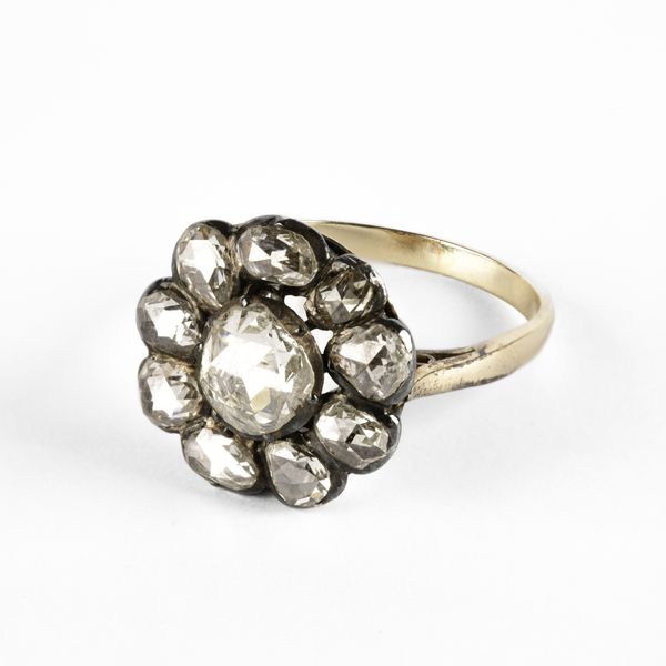 A 19th Century yellow metal and diamond cluster ring, set with round and oval rose cut diamonds, the principal stone approximately 6.5mm, closed back silver settings, size M, total gross weight approximately 3.8g