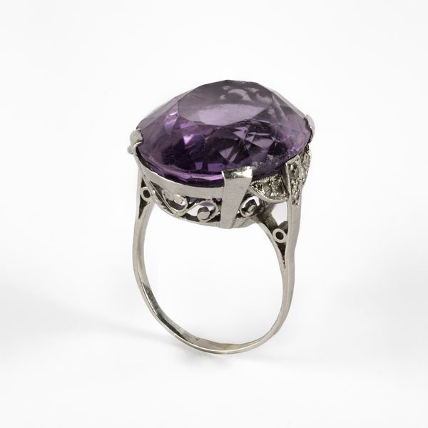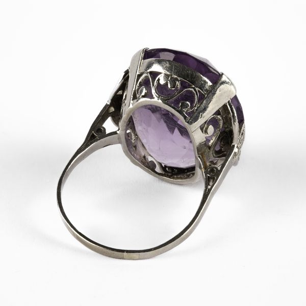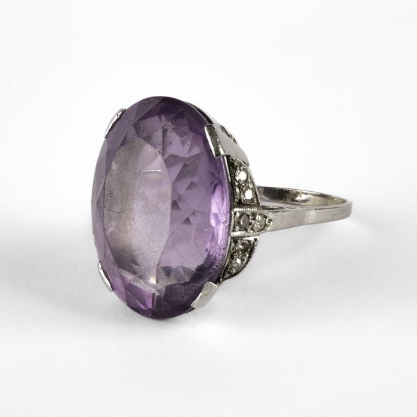An Art Deco amethyst and diamond cocktail ring, set with an oval mixed cut amethyst, approximately 19.96mm x 15.80 x 9.92mm, ring size M, total gross weight approximately 8.1g