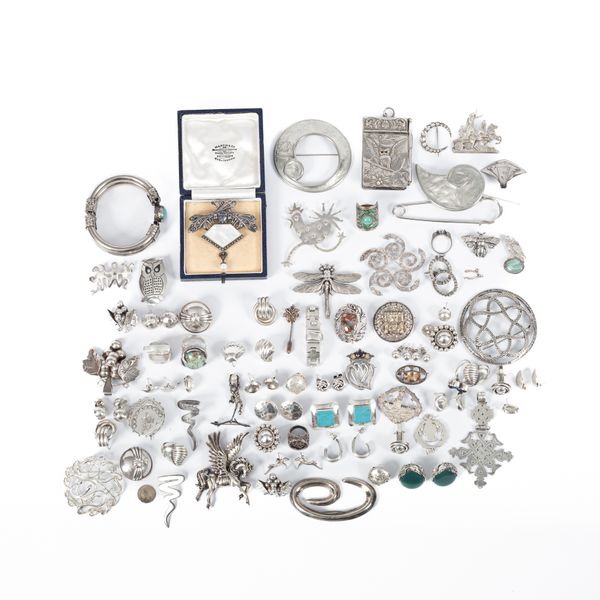 A collection of Victorian and later silver jewellery, including a continental 935 silver and paste set monkey brooch, earrings, bracelets, brooches, rings; together with white metal jewellery, total combined gross weight of silver approximately 531.4g