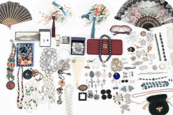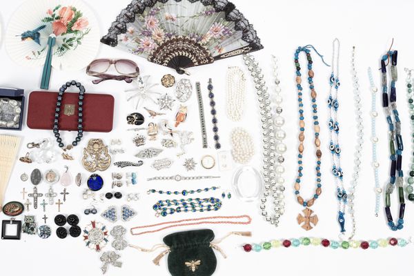 A large collection of costume jewellery, including Butler & Wilson style animal brooches, dress clips, commemorative paste set; fashion beads, fans, YSL sunglasses, rings, etc