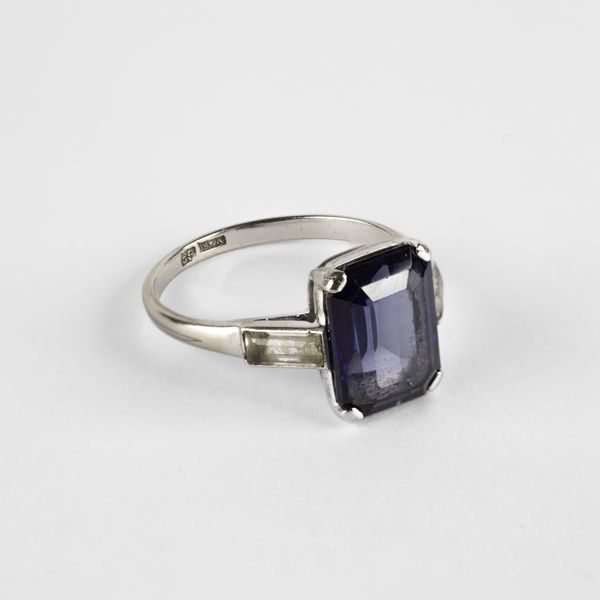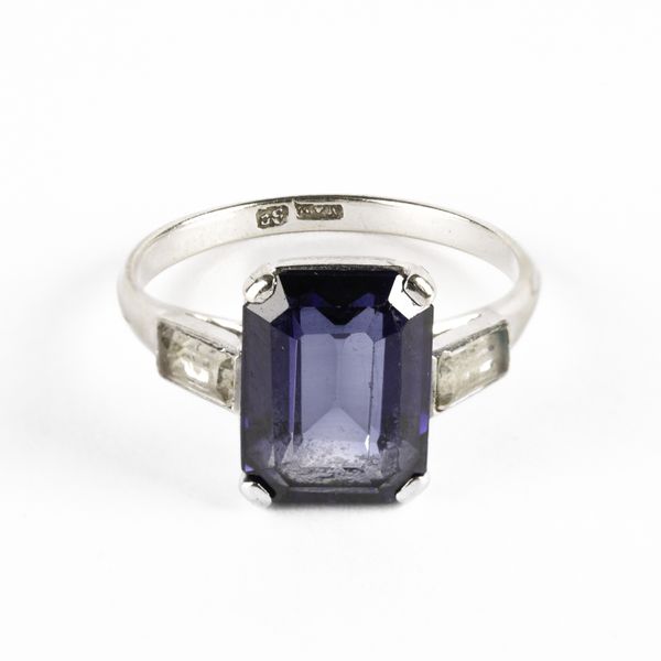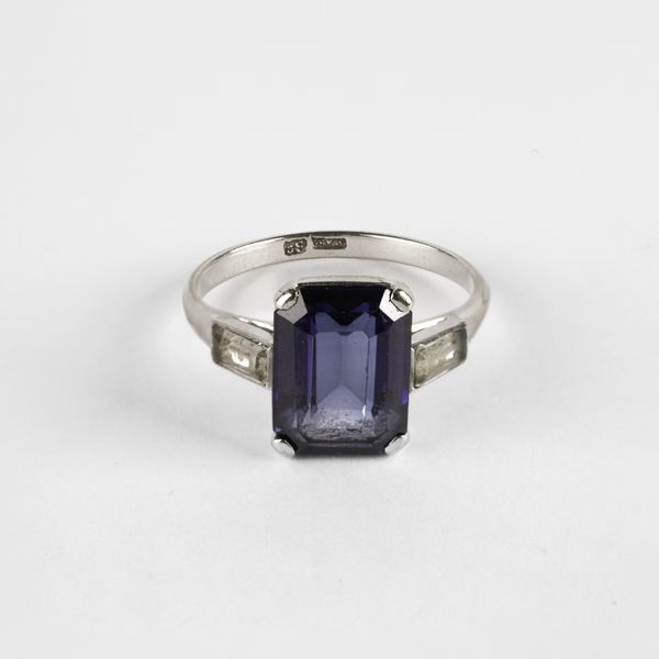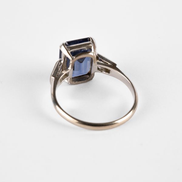 An Art Deco style synthetic sapphire three stone ring, set with a step cut synthetic blue sapphire, flanked by two white baguette cut stones, makers mark 'M&M', stamped '9c', ring size M1/2, total gross weight approximately 2.7g