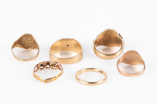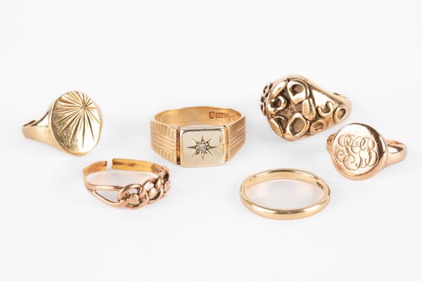 Six yellow metal rings, including a 9ct yelllow gold and diamond chips gents ring, Chester 1946, size R, a 9ct yellow gold signet ring, engraved with initials, size I, a 9ct yellow gold and diamond chip signet ring, size K, a heavy guage 9ct yellow gold stylised ring, size M1/2, a yellow gold band, size M, marks rubbed and a yellow metal ring (af), total combined gross weight approximately 23.7g