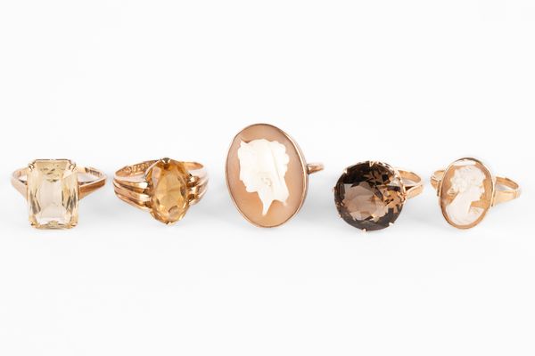 Five yellow metal dress rings, including a large smokey quartz, ring size F, unmarked, a 9ct yellow gold and citrine ring, size M1/2, another 9ct yellow gold and citrine ring, size N, a yellow metal cameo ring, size L, stamped '9ct' and another cameo ring, size M1/2, stamped '9ct', total combined gross weight approximately 18.3g