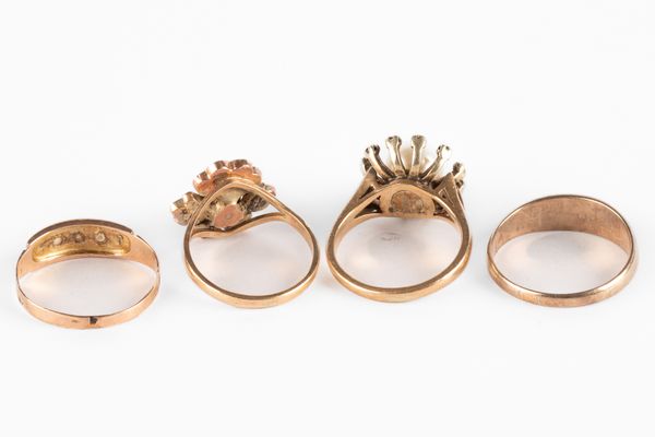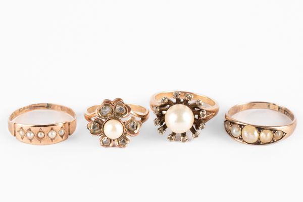 Four yellow metal and pearl rings, including two 9ct yellow gold five stone rings, size O & P1/2, a rose gold pearl and rose cut diamond flowerhead ring, size L, unmarked and a pearl and diamond flowerhead ring, size L1/2, stamped '9ct', total combined gross weight approximately 12g