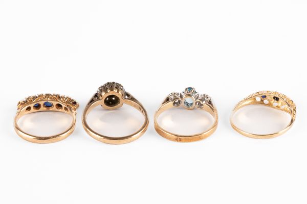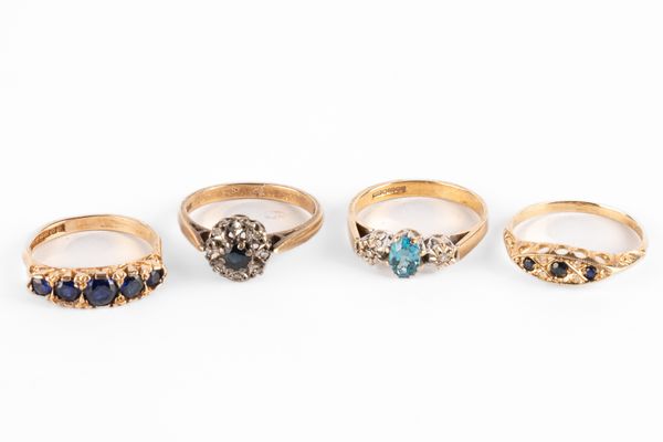 Four yellow metal gem set rings, including a 9ct yellow gold topaz and diamond three stone ring, size M, a 9ct yellow gold sapphire and diamond boat head ring, size N, a 9ct yellow gold sapphire and diamond cluster ring, size N and a 9ct yellow gold synthetic sapphire five stone ring, size K, total combined gross weight approximately 8.8g (4)