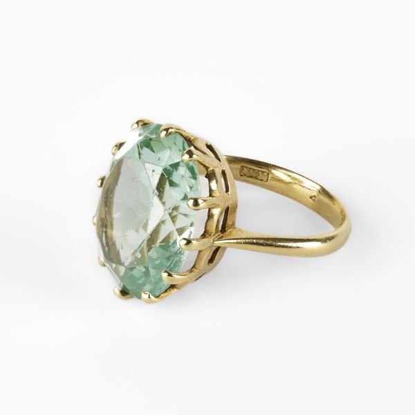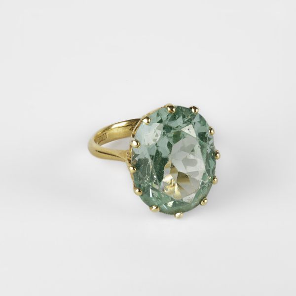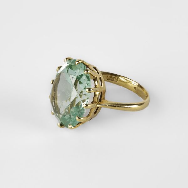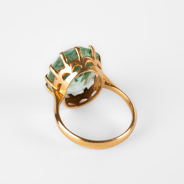 A yellow metal and synthetic green spinel ring, the oval mixed cut stone approximately 17.28mm x 13.40mm x 8.35mm, stamped '22ct', size M1/2, gross weight approximately 6.9g
