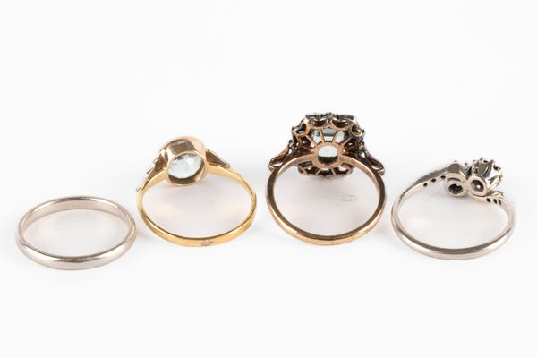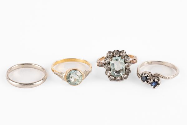 A collection of four rings, including an Art Deco style yellow metal and aquamarine single stone ring, with white metal stylised shoulders, size M, unmarked, gross weight approximately 2g, an aquamarine and colourless stone rectangular cluster ring, size L, unmarked yellow metal, gross weight approximately 3.2g, a sapphire two stone ring with diamond set cross over shoulders, size L1/2 and a platinum band, size L, total combined gross weight approximately 7g