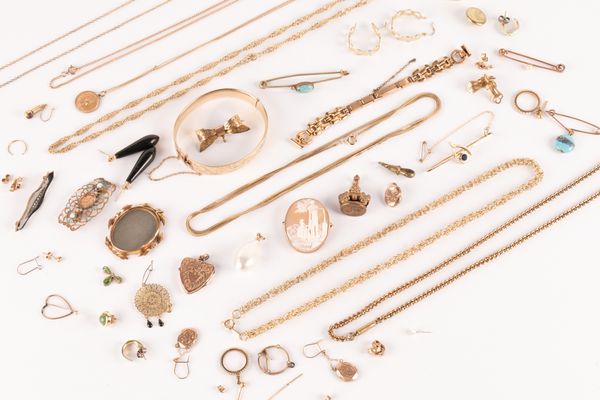 A collection of yellow metal jewellery, including an Edwardian bar brooch, set with a single sapphire within a wishbone, stamped '15ct', gross weight including safety chain approximately 4g, an unmarked yellow metal bar brooch, set with a single pearl, approximately 2.3g, a cameo brooch in yellow metal mount, a yellow metal shield shape locket, a base metal seal fob, yellow metal Victorian earrings, a rolled gold bangle, etc.
