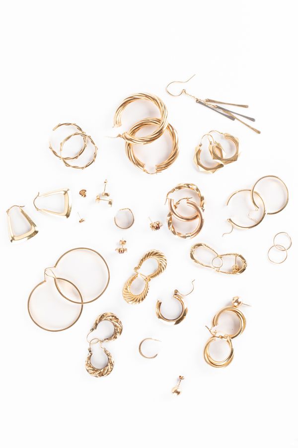 A collection of yellow metal earrings, including 9ct yellow gold hoops of various designs, 9ct gold studs including gem set and three pairs of unmarked yellow metal hoops, total combined gross weight approximately 35g