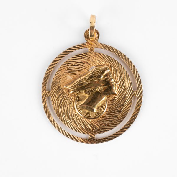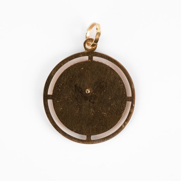 A yellow metal pendant of circular form, cast in relief with the head of Fortuna, continental control marks stamped '18', total gross weight approximately 7.9g