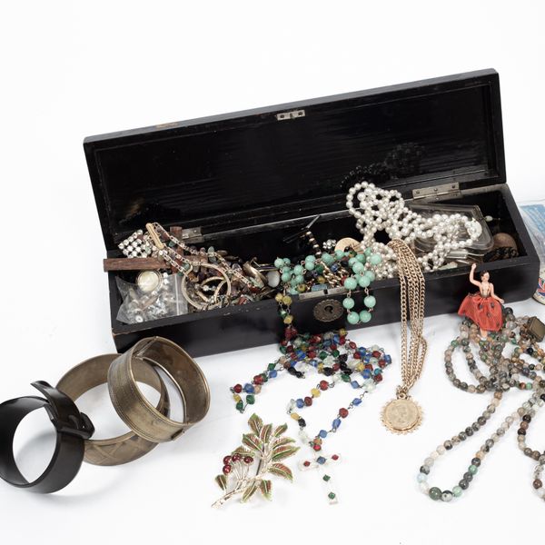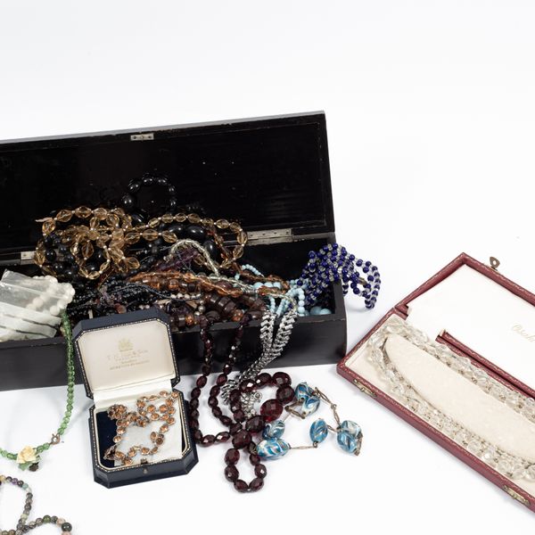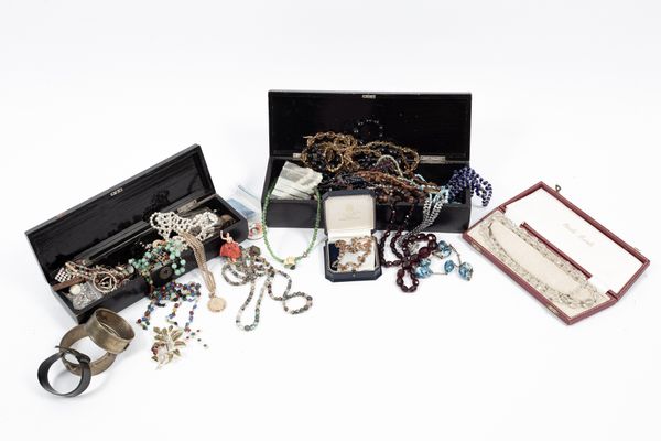 A collection of costume jewellery, including brooches, rings, silver and paste swivel ring, cufflinks, bangles including Bakelite, beads and necklaces including pressed amber, cherry amber style beads, etc. (qty)