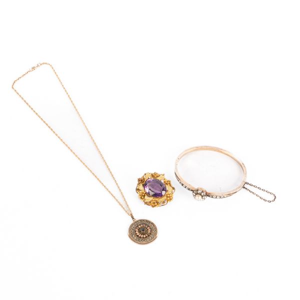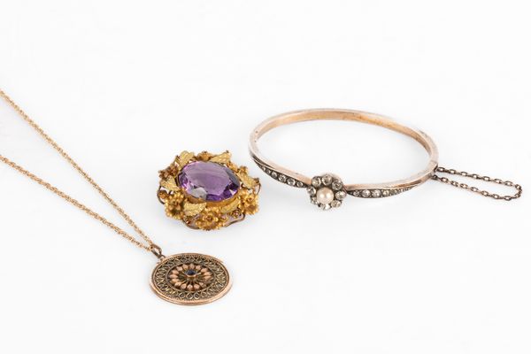 A Victorian yellow metal and amethyst brooch, the large oval mixed cut amethyst within a foliate yellow metal border, together with a white metal hinged bangle set with faux pearl and paste stones, French control marks to clasp and a yellow metal chain stamped '375', approximately 2.8g, suspending a gilt metal pendant
