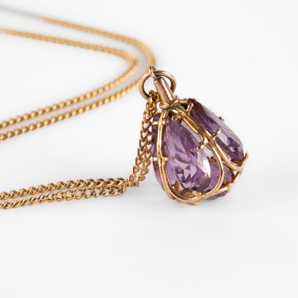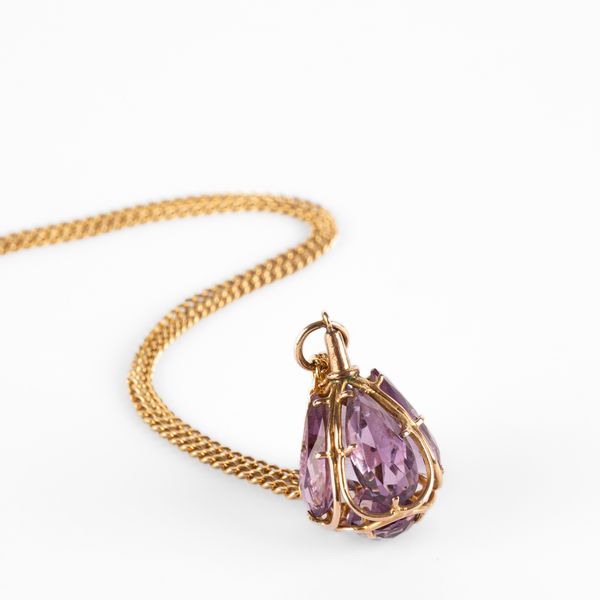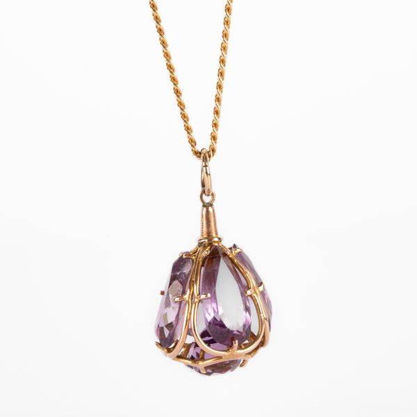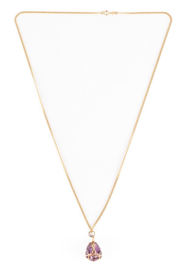 A yellow metal and amethyst pendant necklace, set with facet amethyst in a pear-shaped openwork pendant, suspended from a yellow metal chain, stamped '750', clasp stamped '9k', total gross combined weight approximately 13.4g