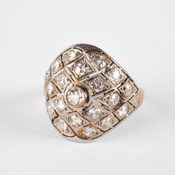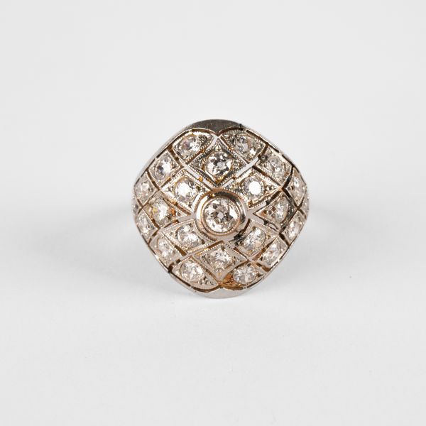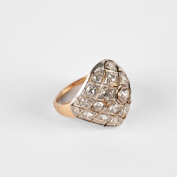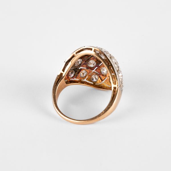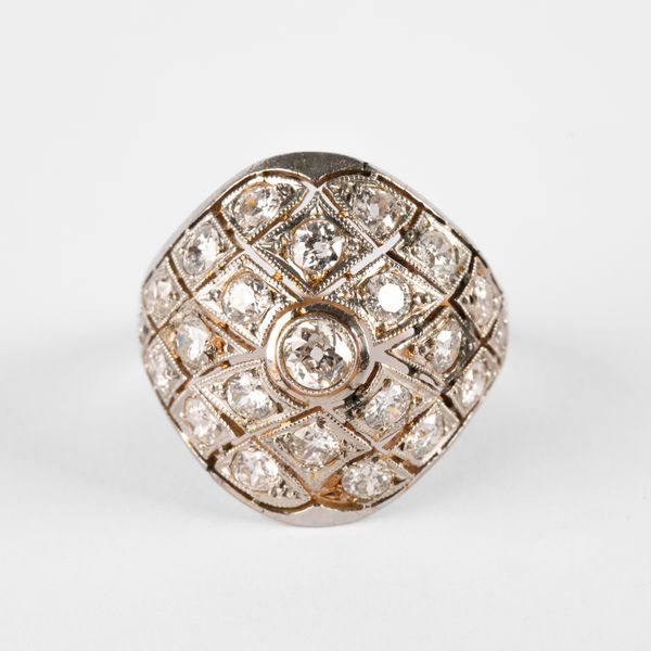 A yellow gold and diamond bombe cocktail ring, set with old and round brilliant cut diamonds, the principal diamond approximately 0.20ct, in pierced lattice work millegrain settings, ring size M½, unmarked, assessed as approximately 18ct, total gross weight approximately 5.7g