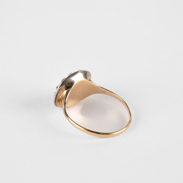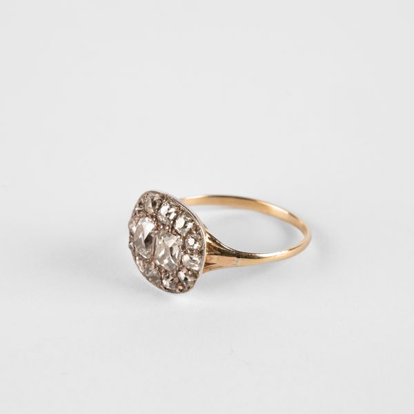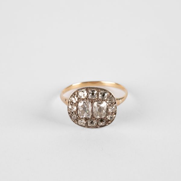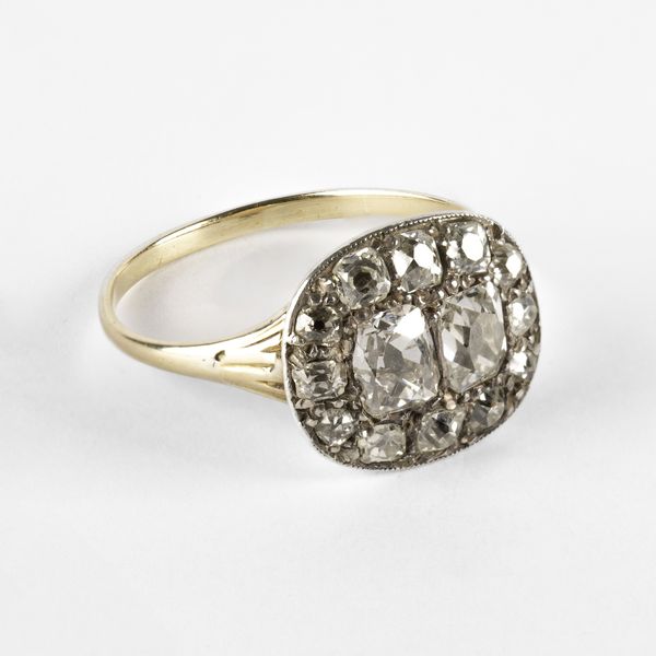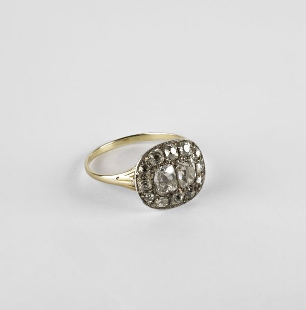 A 19th Century yellow gold and diamond oval cluster ring, set with two rectangular old cut diamonds approximately 5mm x 3.5mm, within a border of twelve smaller old cut diamonds, closed back settings, ring size L½, unmarked, assessed as approximately 18ct with platinum settings, total gross weight approximately 2.6g