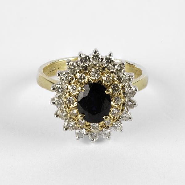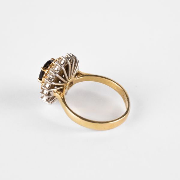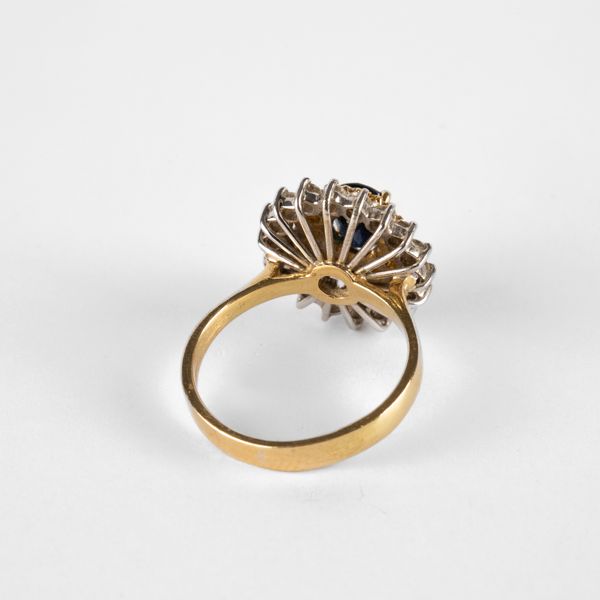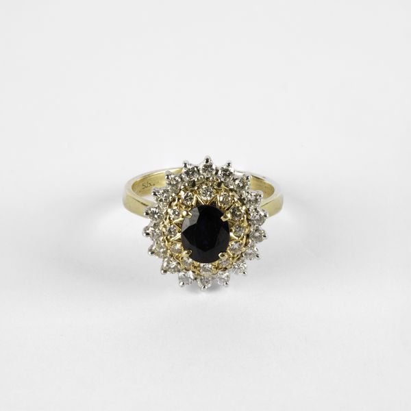 A blue stone and diamond oval cluster ring, probably a sapphire doublet, within a border of round brilliant cut diamonds, ring size M1/2, marks rubbed assessed as 18k yellow and white gold, total gross weight approximately 5.7g