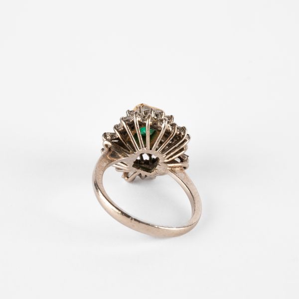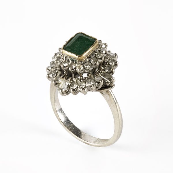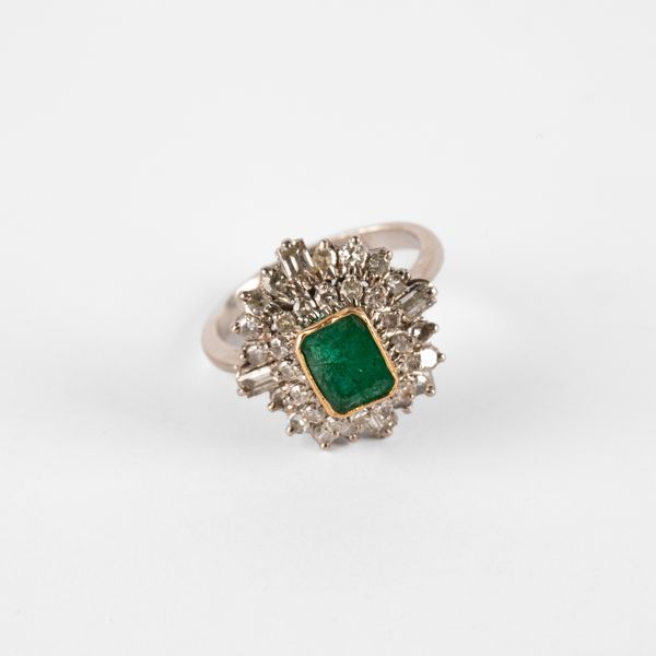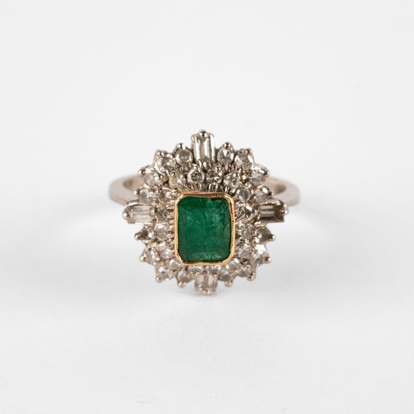 An emerald and diamond dress ring, the emerald approximately 6.3mm x 5.1mm, in yellow gold rub over setting, within two borders of round and baguette cut diamonds, ring size K, unmarked assessed as platinum, total gross weight approximately 5.4g