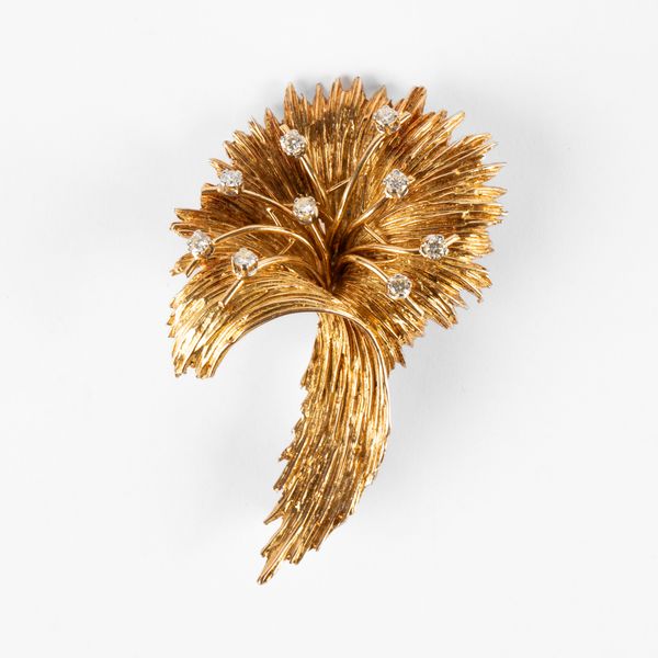 An 18k yellow gold and diamond spray brooch, set with nine round brilliant cut diamonds, approximately 6cm long, sponsor's mark 'CJ Ltd', total gross weight approximately 22g