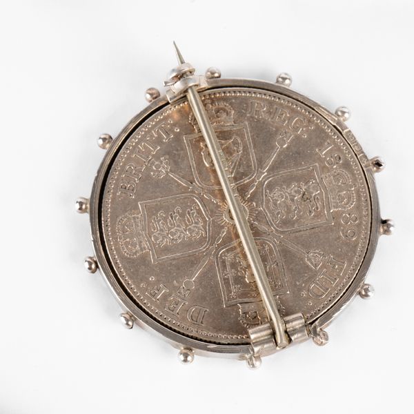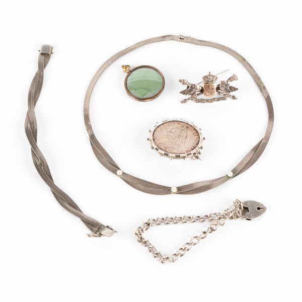 A Victorian silver brooch commemorating Queen Victoria's diamond jubilee, a Victoria 1889 silver crown, mounted in a brooch, a silver curb link bracelet and a continental 800 standard silver necklace and bracelet, total combined gross weight approximately 92.3g, together with an Elizabeth I 1572 hammered silver coin