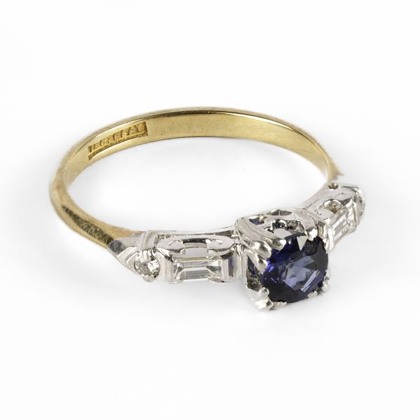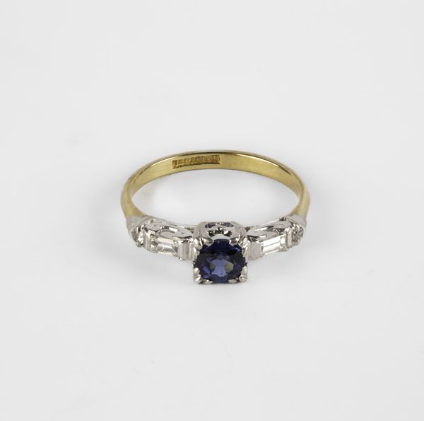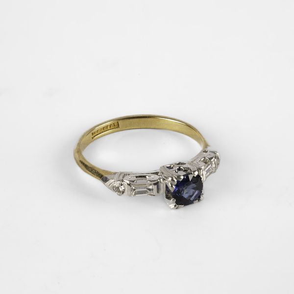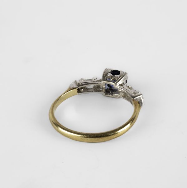 An early 20th century sapphire and diamond ring, set with a round cut sapphire, in a rasied mount, flanked by two baguette cut diamonds and two round-cut diamonds, white metal settings, yellow metal shank, stamped '18c plat', ring size O, total gross weight approximately 3.6g