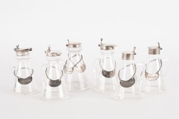 Six George V silver capped glass whisky noggins, mixed dates and makers, the largest 11.5cm high and seven silver whisky labels